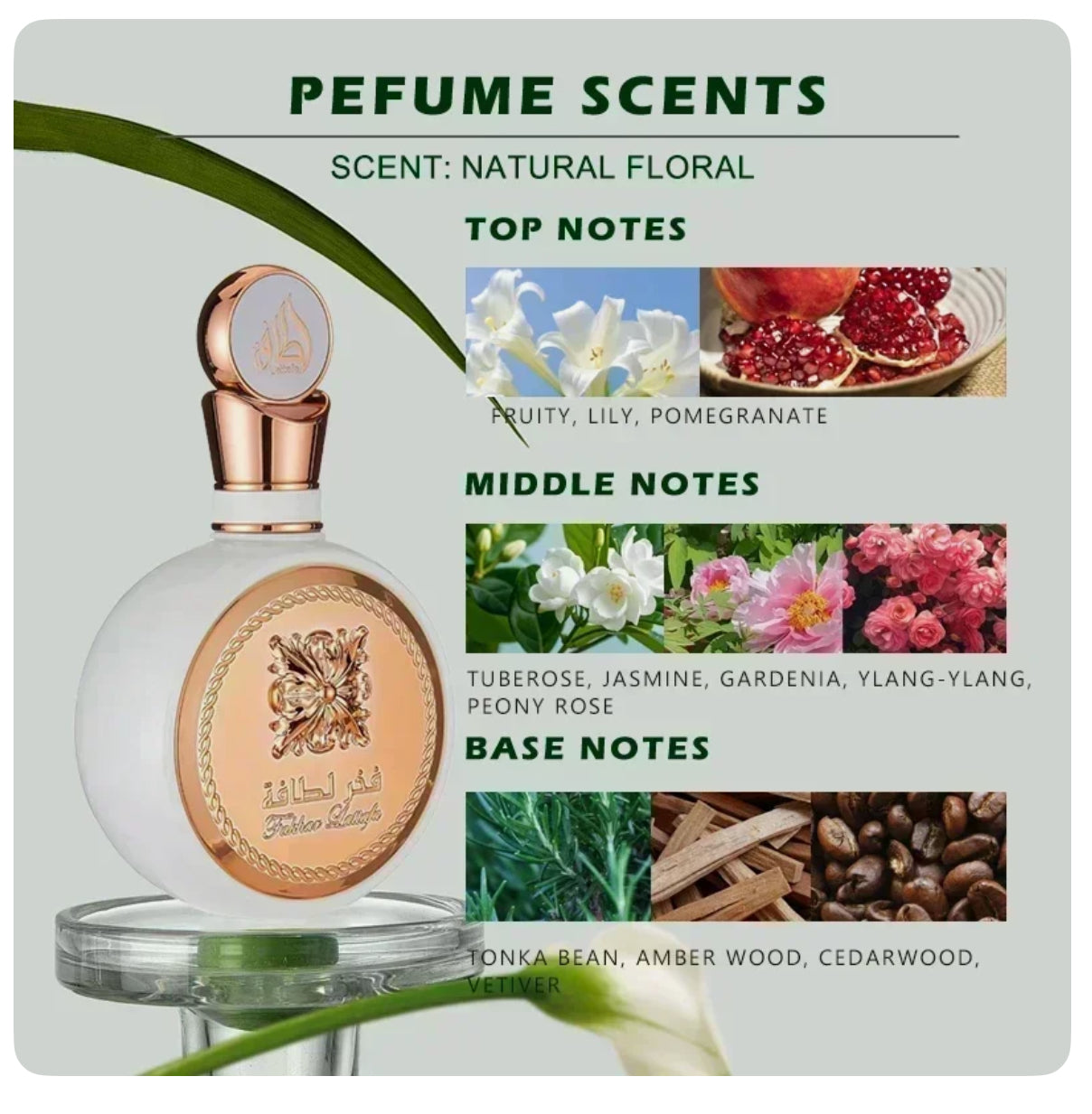 Light and fruity, this perfume opens on top notes of aldehydes, lilies, pomegranates and fruits. The sensual heart note revels in floral bouquet of roses, jasmine, and gardenias. The finish is provided by a long lasting base of vanilla, sandalwood, ambroxan and white musk.